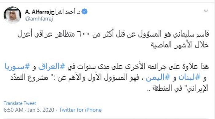 وقال في تغريدة عبر "تويتر" رصدها "المشهد العربي": "قاسم سليماني هو المسؤول عن قتل أكثر من ٦٠٠ متظاهر عراقي أعزل خلال الأشهر الماضية.. هذا علاوة على جرائمه الأخرى على مدى سنوات في العراق و سوريا ولبنان واليمن، فهو المسؤول الأول والأهم عن مشروع التمدّد الإيراني في المنطقة".