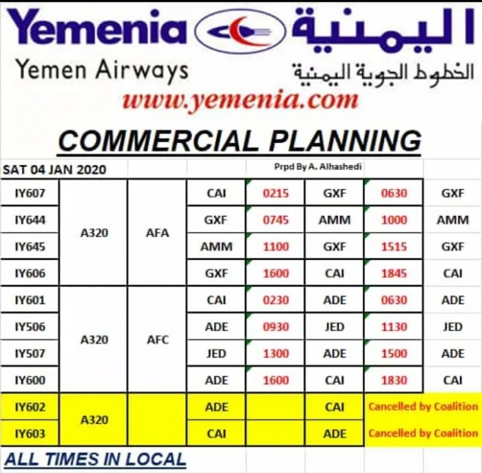 ينشر المشهد العربي جدول رحلات طيران اليمنية غدا السبت الموافق 4 يناير 2020.