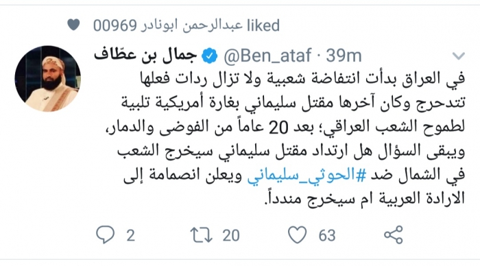 تفاعل عضو الجمعية الوطنية الجنوبية جمال بن عطاف، مع هاشتاج "الحوثي سليماني"، والذي تم إطلاقه تزامنا مع مقتل قائد فيلق القدس اللواء الإيراني قاسم سليماني في ضربة أمريكية، استهدفته في ساعة مبكرة من يوم الجمعة قرب مطار بغداد الدولي.