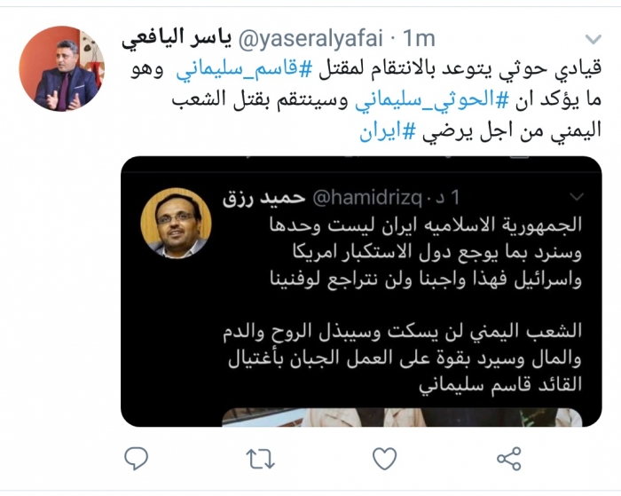 وكتب اليافعي، في تغريدة له عبر موقع التواصل الاجتماعي تويتر، تابعها المشهد العربي: "قيادي حوثي يتوعد بالانتقام لمقتل قاسم سليماني، وهو ما يؤكد أن الحوثي سليماني وسينتقم بقتل الشعب اليمني من أجل أن يرضي إيران".