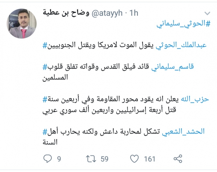 تفاعل عضو الجمعية الوطنية الجنوبية وضاح بن عطية، مع هاشتاج "الحوثي سليماني".