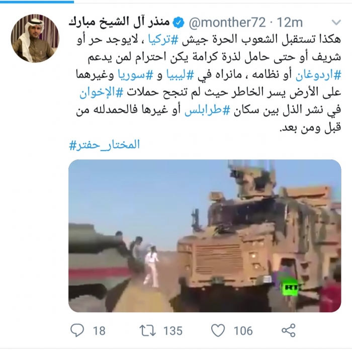 نشر المغرد السعودي البارز منذر آل الشيخ مبارك، مقطعا مصورا لاستقبال الشعب الليبي لقوات الجيش التركي.