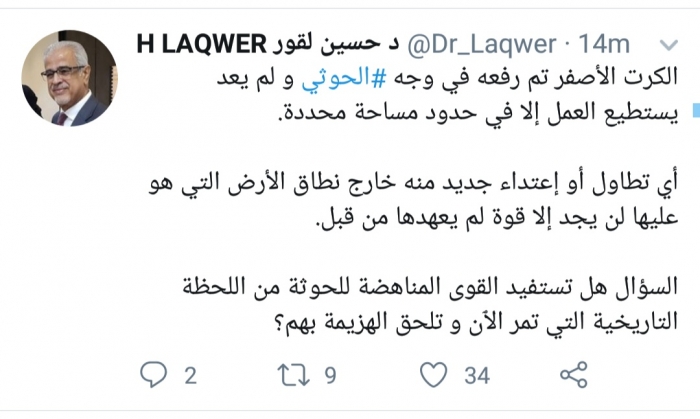 وكتب لقور، في تغريدة له عبر موقع التواصل الاجتماعي تويتر، تابعها المشهد العربي: "الكارت الأصفر تم رفعه في وجه الحوثي ولم يعد يستطيع العمل إلا في حدود مساحة محددة".