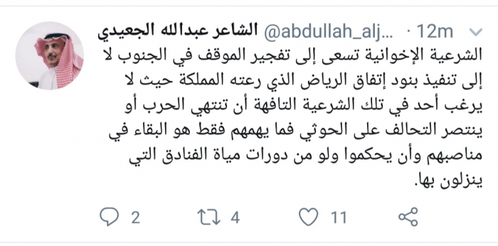 وكتب الجعيدي، في تغريدة له عبر موقع التواصل الاجتماعي تويتر، تابعها المشهد العربي: "الشرعية الإخوانية تسعى إلى تفجير الموقف في الجنوب لا إلى تنفيذ بنود اتفاق الرياض الذي رعته المملكة".