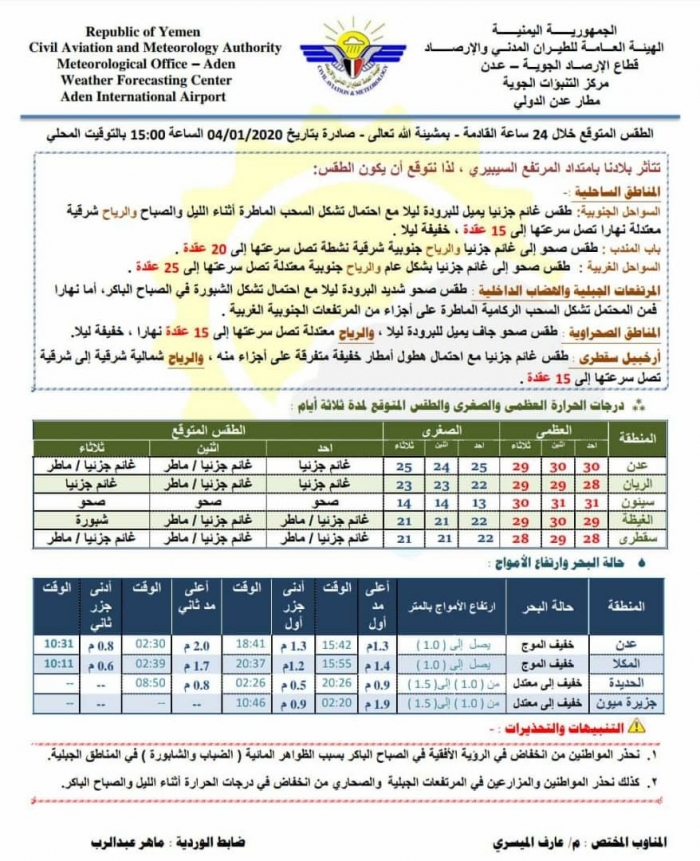 ولفتت إلى أن باب المندب سيكون الطقس فيه صحو إلى غائم جزئياً والرياح الجنوبية معتدلة وتصل سرعتها إلى 20 عقدة.