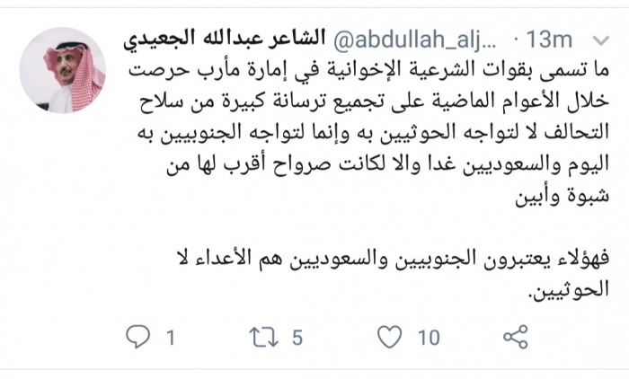 أكد الشاعر عبدالله الجعيدي، أن مليشيات الإخوان التابعة للشرعية، تعتبر الجنوبيين والسعوديين هم الأعداء لا الحوثيين.