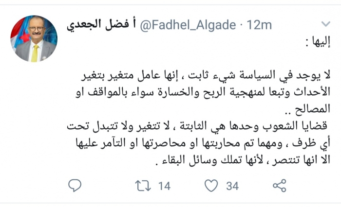 أكد عضو هيئة رئاسة المجلس الانتقالي الجنوبي فضل الجعدي، أنه لا يوجد في السياسة شيء ثابت.