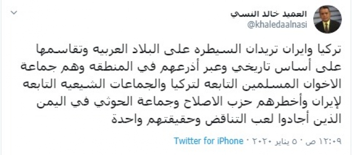 وكتب "النسي" في تغريدة عبر حسابه بتويتر، رصدها "المشهد العربي" قال فيها: "تركيا وإيران تريدان السيطرة على البلاد العربية وتقاسمها على أساس تاريخي وعبر أذرعهم في المنطقة وهم جماعة الإخوان المسلمين التابعه لتركيا والجماعات الشيعيه التابعه لإيران وأخطرهم حزب الإصلاح وجماعة الحوثي في اليمن الذين أجادوا لعب التناقض وحقيقتهم واحدة".