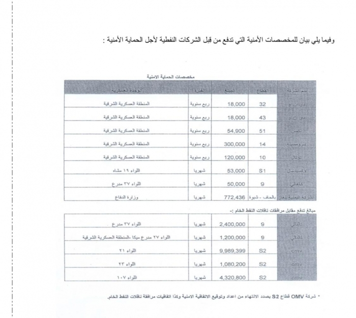 ونفى التقرير دخول المبالغ التي تحصلها المناطق العسكرية والألوية المنتشرة في مناطق التنقيب والإنتاج إلى خزينة الدولة، مؤكدا أن القيادات العسكرية كانت تقتطعها لصالحها.
