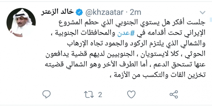 وكتب الزعتر، في تغريدة له عبر موقع التواصل الاجتماعي تويتر، تابعها المشهد العربي: "جلست أفكر هل يستوي الجنوبي الذي حطم المشروع الإيراني تحت أقدامه في عدن والمحافظات الجنوبية، والشمالي الذي يلتزم الركود والجمود تجاه الإرهاب الحوثي".