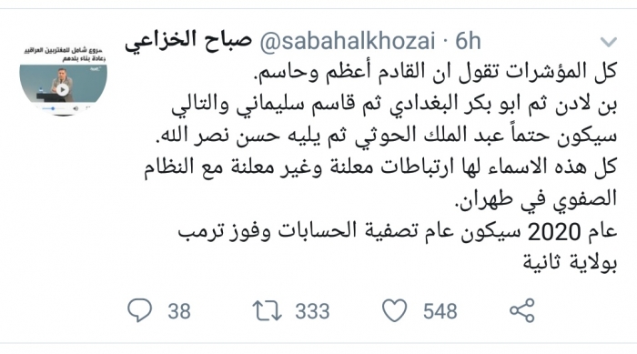 وكتب الخزاعي، في تغريدة له عبر موقع التواصل الاجتماعي تويتر، تابعها المشهد العربي: "كل المؤشرات تقول إن القادم أعظم وحاسم.. بن لادن ثم أبو بكر البغدادي ثم قاسم سليماني والتالي سيكون حتماً عبد الملك الحوثي ثم يليه حسن نصر الله".