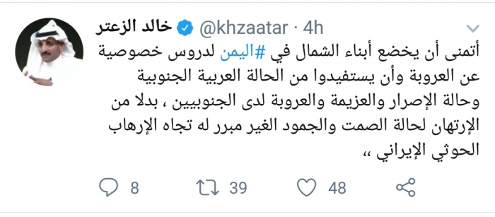 وكتب الزعتر، في تغريدة له عبر موقع التواصل الاجتماعي تويتر، تابعها المشهد العربي: "أتمنى أن يخضع أبناء الشمال في اليمن لدروس خصوصية عن العروبة وأن يستفيدوا من الحالة العربية الجنوبية وحالة الإصرار والعزيمة والعروبة لدى الجنوبيين، بدلا من الإرتهان لحالة الصمت والجمود الغير مبرر له تجاه الإرهاب الحوثي الإيراني".