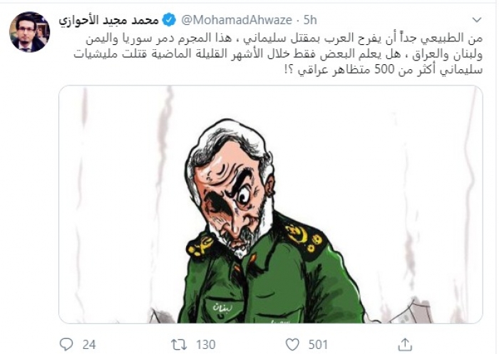 وقال في تغريدة عبر "تويتر" رصدها "المشهد العربي": "من الطبيعي جداً أن يفرح العرب بمقتل سليماني، هذا المجرم دمر سوريا واليمن ولبنان والعراق، هل يعلم البعض فقط خلال الأشهر القليلة الماضية قتلت مليشيات سليماني أكثر من 500 متظاهر عراقي".