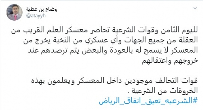 وقال في تغريدة عبر "تويتر" رصدها "المشهد العربي": "لليوم الثامن وقوات الشرعية تحاصر معسكر العلم القريب من العقلة من جميع الجهات وأي عسكري من النخبة يخرج من المعسكر لا يسمح له بالعودة والبعض يتم ترصدهم عند خروجهم واعتقالهم".
