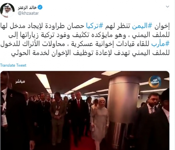 وقال في تغريدة عبر "تويتر" رصدها "المشهد العربي": "إخوان اليمن تنظر لهم تركيا حصان طراودة لإيجاد مدخل لها للملف اليمني، وهو ما يؤكده تكثيف وفود تركية زياراتها إلى مأرب للقاء قيادات إخوانية عسكرية، محاولات الأتراك للدخول للملف اليمني تهدف لإعادة توظيف الإخوان لخدمة الحوثي".