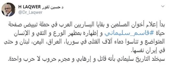وقال في تغريدة عبر "تويتر" رصدها "المشهد العربي": "بدأ إعلام إخوان المسلمين وبقايا اليساريين العرب في حملة تبييض صفحة حياة قاسم سليماني وإظهاره بمظهر الورع والتقي والإنسان المتواضع و تناسوا دماء آلاف القتلى في سوريا، العراق، اليمن، لبنان وحتى في إيران نفسها".