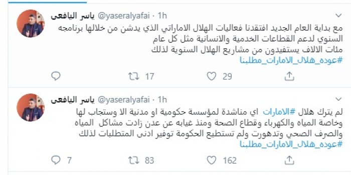 وقال في تغريدات عبر "تويتر" رصدها "المشهد العربي": "لم يترك هلال الإمارات أي مناشدة لمؤسسة حكومية أو مدنية إلا واستجاب لها وخاصة المياه والكهرباء وقطاع الصحة ومنذ غيابه عن عدن زادت مشاكل المياه والصرف الصحي وتدهورت ولم تستطيع الحكومة توفير أدنى المتطلبات لذلك عودة هلال الإمارات مطلبنا".