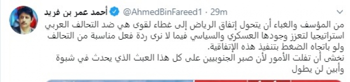 وقال في تغريدة عبر "تويتر" رصدها "المشهد العربي": "من المؤسف و.... أن يتحول اتفاق الرياض إلى غطاء لقوى هي ضد التحالف العربي استراتيجيًا لتعزز وجودها العسكري والسياسي فيما لا نرى ردة فعل مناسبة من التحالف ولو باتجاه الضغط بتنفيذ هذه الاتفاقية".