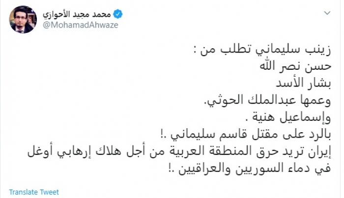وقال في تغريدة عبر "تويتر" رصدها "المشهد العربي": "زينب سليماني تطلب من: حسن نصر الله بشار الأسد.. وعمها عبدالملك الحوثي.. وإسماعيل هنية.. بالرد على مقتل قاسم سليماني .! إيران تريد حرق المنطقة العربية من أجل هلاك إرهابي أوغل في دماء السوريين والعراقيين".