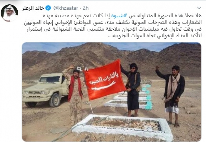وقال في تغريدة عبر "تويتر" رصدها "المشهد العربي": "هل فعلاً هذه الصورة المتداولة في شبوه إذا كانت نعم فهذه مصيبة فهذه الشعارات وهذه الصرخات الحوثية تكشف مدى عمق التواطؤ الإخواني تجاه الحوثيين في وقت تحاول فيه ميليشيات الإخوان ملاحقة منتسبي النخبة الشبوانية في استمرار لتأكيد العداء الإخواني تجاه القوات الجنوبية".