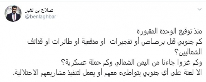 وقال في تغريدة عبر "تويتر" رصدها "المشهد العربي": "منذ توقيع الوحدة المقبورة كم جنوبي قتل برصاص أو تفجيرات أو مدفعية أو طائرات أو قذائف الشماليين؟".