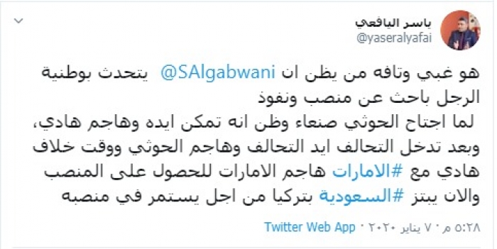 وكتب "اليافعي" في تغريدة عبر حسابه بتويتر، رصدها "المشهد العربي": هو غبي وتافه من يظن أن الجبواني يتحدث بوطنية، الرجل باحث عن منصب ونفوذ".