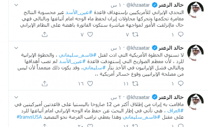 وكتب الزعتر عبر "تويتر":"ماقامت به إيران من إطلاق أكثر من 12 صاروخا باليستيا على قاعدتين أميركيتين في العراق ، هي تأتي في إطار البحث عن حفظ ماء الوجه الإيراني أمام أتباعها للرد على مقتل قاسم سليماني وهذا يعطي ترامب الفرصة نحو التصعيد ".