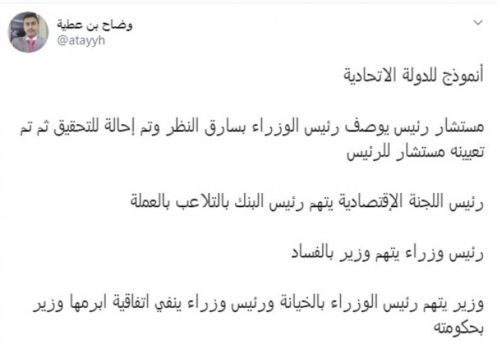 وقال في تغريدة عبر "تويتر" رصدها "المشهد العربي": "أنموذج للدولة الاتحادية مستشار رئيس يوصف رئيس الوزراء بسارق النظر وتم إحالته للتحقيق ثم تم تعيينه مستشار للرئيس.. رئيس اللجنة الاقتصادية يتهم رئيس البنك بالتلاعب بالعملة.. رئيس وزراء يتهم وزير بالفساد.. وزير يتهم رئيس الوزراء بالخيانة ورئيس وزراء ينفي اتفاقية ابرمها وزير بحكومته".