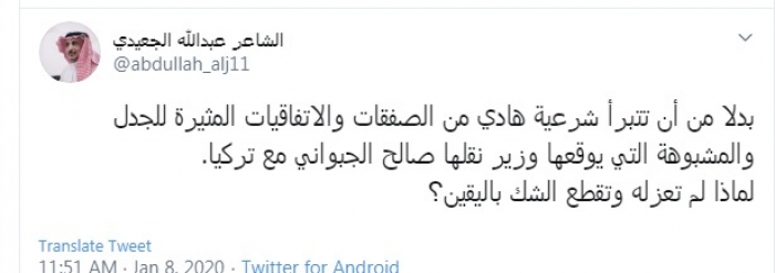 وقال في تغريدة عبر "تويتر" رصدها "المشهد العربي": "بدلاً من أن تتبرأ شرعية هادي من الصفقات والاتفاقيات المثيرة للجدل والمشبوهة التي يوقعها وزير نقلها صالح الجبواني مع تركيا. لماذا لم تعزله وتقطع الشك باليقين؟".