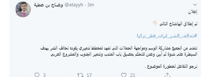 وقال في تغريدة عبر "تويتر" رصدها "المشهد العربي": "إعلان تم إطلاق الهاشتاج التالي تحالف الشر إيران قطر تركيا.. نتمنى من الجميع مشاركة الوسم ومواجهة الحملات التي تمهد لمخطط تدميري يقوده تحالف الشر بهدف السيطرة على شبوة ثم أبين وعدن للتحكم بمضيق باب المندب وتدمير الجنوب والمشروع العربي نرجو التفاعل لخطورة الموضوع".