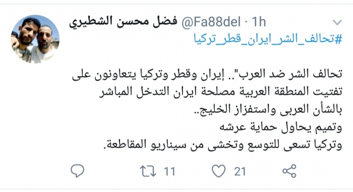 تفاعل رئيس دائرة الشباب بالمجلس الانتقالي الجنوبي فضل محسن الشطيري مع هاشتاج "تحالف الشر ايران قطر تركيا".