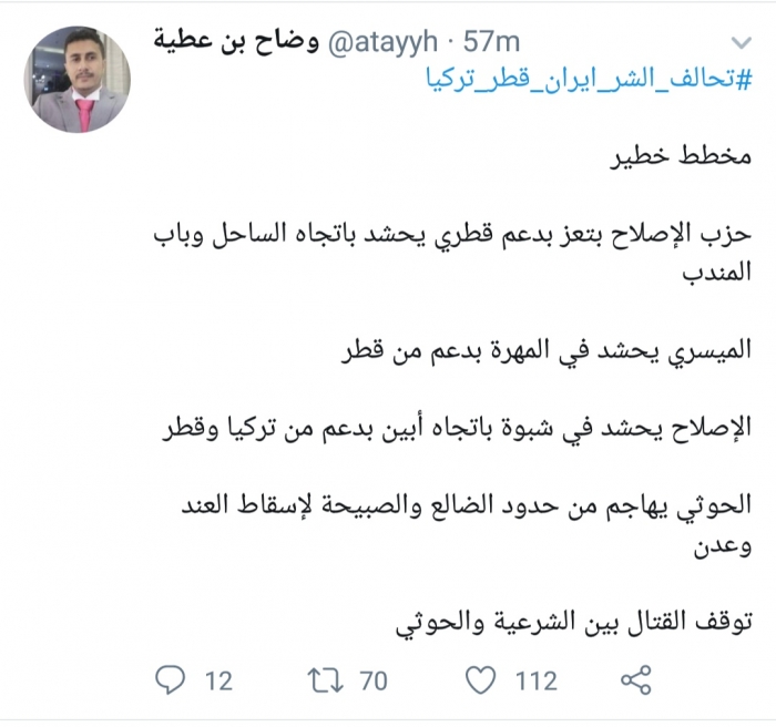وكتب بن عطية، في تغريدة له عبر موقع التواصل الاجتماعي تويتر، تابعها المشهد العربي: "مخطط خطير.. حزب الإصلاح بتعز بدعم قطري يحشد باتجاه الساحل وباب المندب".