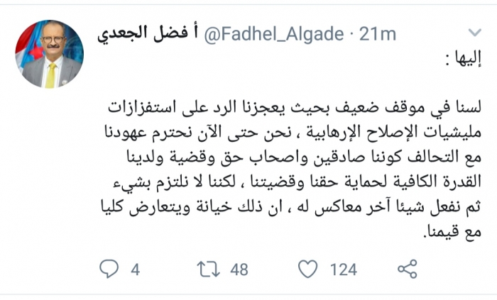 شدد عضو هيئة رئاسة المجلس الانتقالي الجنوبي فضل الجعدي، على احترام المجلس الانتقالي الجنوبي لعهوده مع التحالف العربي والتزامه بالاتفاق.