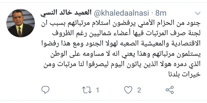 وكتب النسي، في تغريدة له عبر موقع التواصل الاجتماعي تويتر، تابعها المشهد العربي: "جنود من الحزام الأمني يرفضون استلام مرتباتهم بسبب أن لجنة صرف المرتبات فيها أعضاء شماليين رغم الظروف الاقتصادية والمعيشية الصعبة لهؤلاء الجنود ومع هذا رفضوا يستلمون مرتباتهم".