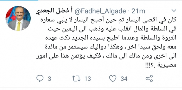 وكتب الجعدي، في تغريدة له على موقع التواصل الاجتماعي تويتر، تابعها المشهد العربي: "كان في أقصى اليسار ثم حين أصبح اليسار لا يلبي سعاره في السلطة والمال انقلب عليه وذهب إلى اليمين حيث الثروة والسلطة".