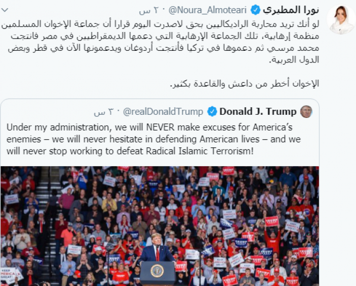 ووجهت المطيري رسالة للرئيس الأمريكي دونالد ترامب عبر تويتر قائلة:" لو أنك تريد محاربة الراديكاليين بحق لأصدرت اليوم قرارا أن جماعة الإخوان المسلمين منظمة إرهابية".