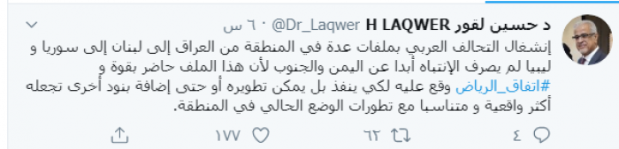 وكتب لقور عبر "تويتر":"انشغال التحالف العربي بملفات عدة في المنطقة من العراق إلى لبنان إلى سوريا و ليبيا لم يصرف الانتباه أبدا عن اليمن والجنوب لأن هذا الملف حاضر بقوة".