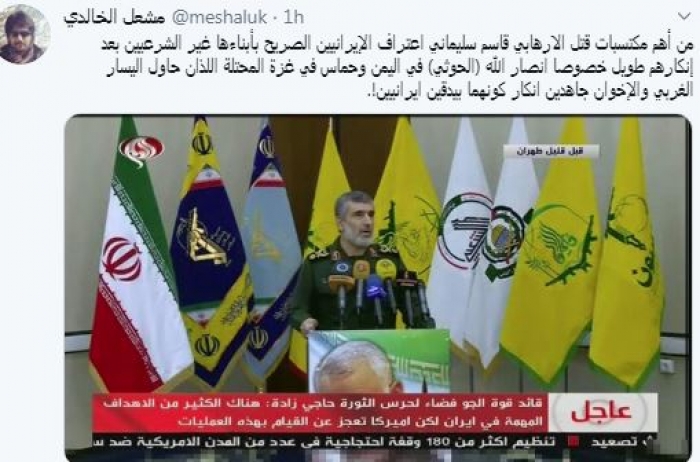 أكد المدون السعودي البارز مشعل الخالدي، اليوم، أن اعتراف إيران بأذنابها في المنطقة مثل حركة حماس ومليشيات الحوثي يُعتبر من أهم مكتسبات مقتل قاسم سليماني.