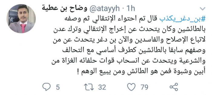 وتابع: "الآن بن دغر يتحدث عن من وصفهم سابقا بالطائشين كطرف أساسي مع التحالف والشرعية ويتحدث عن انسحاب قوات حلفائه الغزاة من أبين وشبوة.. فمن هو الطائش ومن يبيع الوهم؟".