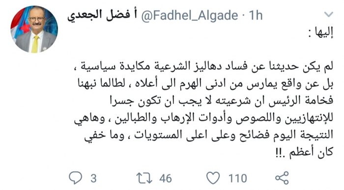 وكتب الجعدي، في تغريدة له على موقع التواصل الاجتماعي تويتر، تابعها المشهد العربي: "لم يكن حديثنا عن فساد دهاليز الشرعية مكايدة سياسية، بل عن واقع يمارس من أدنى الهرم إلى أعلاه".