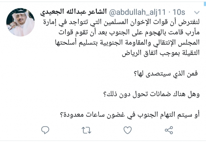 وكتب الجعيدي، في تغريدة له على موقع التواصل الاجتماعي تويتر، تابعها المشهد العربي: "لنفترض أن قوات الإخوان المسلمين التي تتواجد في إمارة مأرب قامت بالهجوم على الجنوب بعد أن تقوم قوات المجلس الانتقالي والمقاومة الجنوبية بتسليم أسلحتها الثقيلة بموجب اتفاق الرياض.. فمن الذي سيتصدى لها؟".