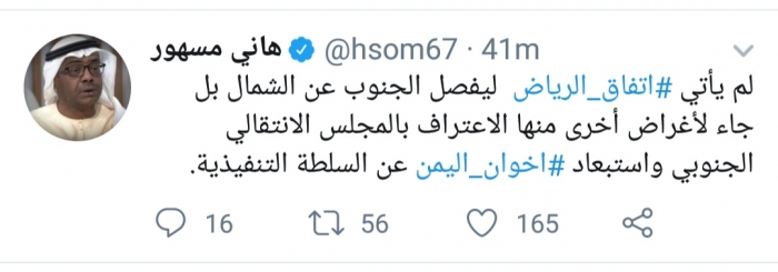 وكتب مسهور، في تغريدة له على موقع التواصل الاجتماعي تويتر، تابعها المشهد العربي: "لم يأتي اتفاق الرياض ليفصل الجنوب عن الشمال بل جاء لأغراض أخرى منها الاعتراف بالمجلس الانتقالي الجنوبي واستبعاد إخوان اليمن عن السلطة التنفيذية".