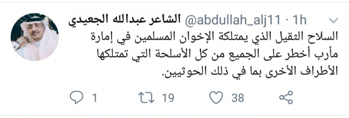حذر الشاعر عبدالله الجعيدي، من خطورة السلاح الذي تمتلكه مليشيات الإخوان الإرهابية التابعة للشرعية في مأرب.
