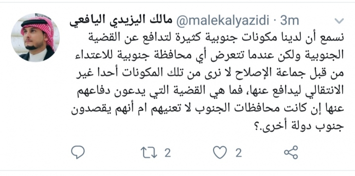 وكتب اليافعي، في تغريدة له على موقع التواصل الاجتماعي تويتر، تابعها المشهد العربي: "نسمع أن لدينا مكونات جنوبية كثيرة لتدافع عن القضية الجنوبية ولكن عندما تتعرض أي محافظة جنوبية للاعتداء من قبل جماعة الإصلاح لا نرى من تلك المكونات أحدا غير الانتقالي ليدافع عنها".