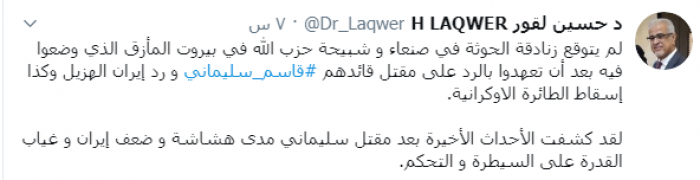وكتب لقور عبر "تويتر":"لم يتوقع زنادقة الحوثة في صنعاء و شبيحة حزب الله في بيروت المأزق الذي وضعوا فيه بعد أن تعهدوا بالرد على مقتل قائدهم قاسم سليماني و رد إيران الهزيل وكذا إسقاط الطائرة الأوكرانية"..
