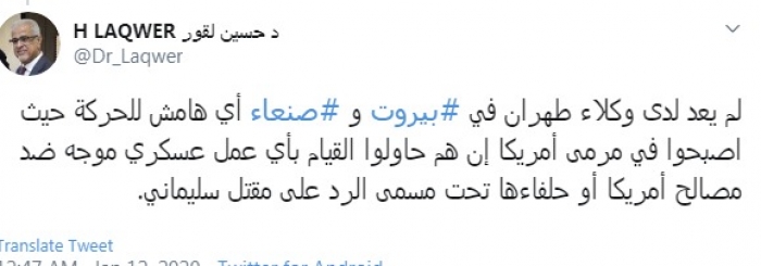 وكتب في تغريدة عبر "تويتر" رصدها "المشهد العربي": "لم يعد لدى وكلاء طهران في بيروت وصنعاء أي هامش للحركة حيث اصبحوا في مرمى أمريكا إن هم حاولوا القيام بأي عمل عسكري موجه ضد مصالح أمريكا أو حلفاءها تحت مسمى الرد على مقتل سليماني".