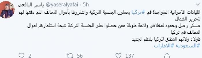 وقال في تغريدة عبر "تويتر" رصدها "المشهد العربي": "القيادات الإخوانية المتواجدة في تركيا يحملون الجنسية التركية واشتروها بأموال التحالف التي دفعها لهم لتحرير الشمال عسكر زعيل وحمود المخلافي وقائمة طويلة ممن حصلوا على الجنسية التركية نتيجة استثمارهم أموال التحالف في تركيا هؤلاء ولائهم المطلق لتركيا بلدهم الجديد".