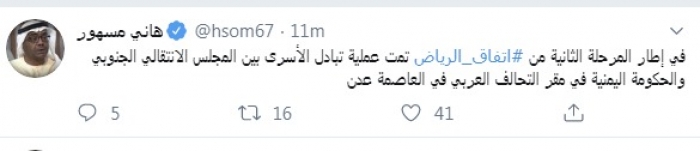 وقال في تغريدة عبر "تويتر" رصدها "المشهد العربي": "في إطار المرحلة الثانية من اتفاق الرياض تمت عملية تبادل الأسرى بين المجلس الانتقالي الجنوبي والحكومة اليمنية في مقر التحالف العربي في العاصمة عدن".