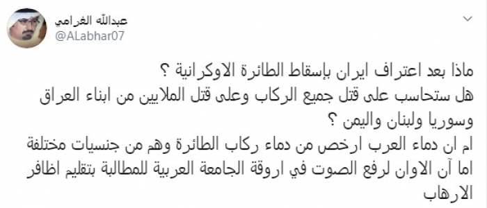 وقال في تغريدة عبر "تويتر" رصدها "المشهد العربي": "ماذا بعد اعتراف إيران بإسقاط الطائرة الأوكرانية؟ هل ستحاسب على قتل جميع الركاب وعلى قتل الملايين من أبناء العراق وسوريا ولبنان واليمن؟".