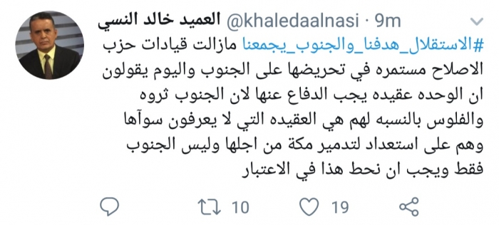 وكتب النسي، في تغريدة له على موقع التواصل الاجتماعي تويتر، تابعها المشهد العربي: " مازالت قيادات حزب الإصلاح مستمرة في تحريضها على الجنوب واليوم يقولون إن الوحدة عقيدة يجب الدفاع عنها لأن الجنوب ثروة".